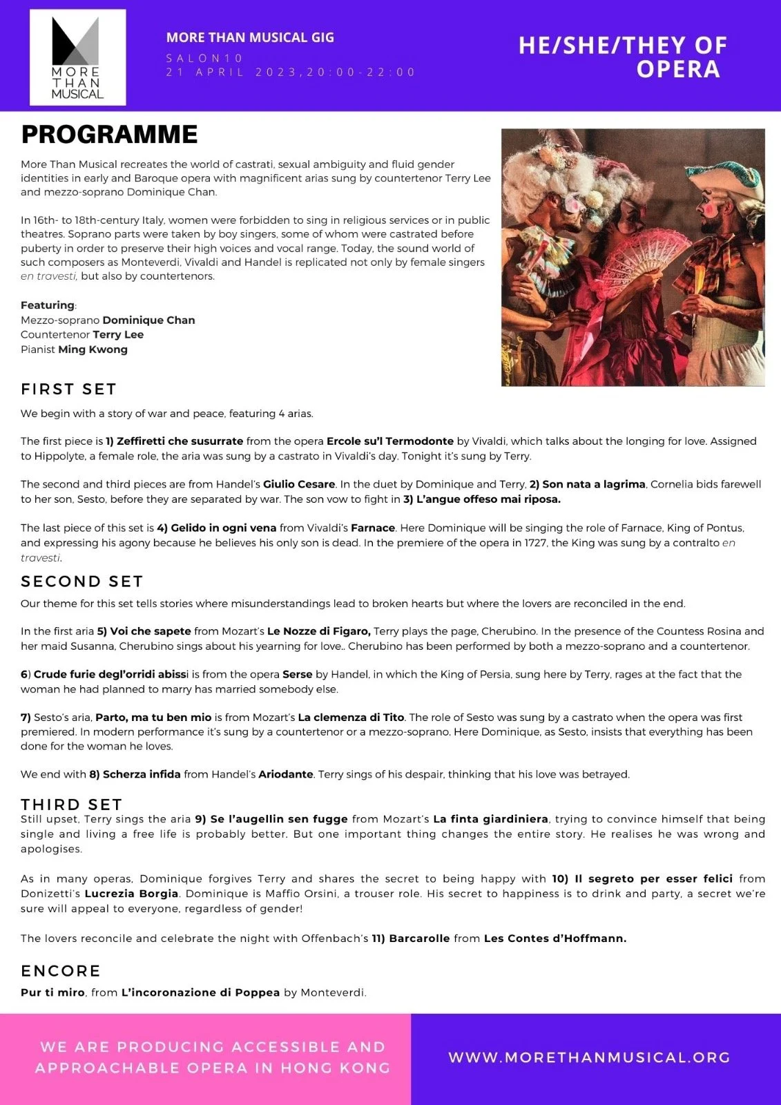 More Than Musical recreates the world of castrati, sexual ambiguity and fluid gender identities in early and Baroque opera with magnificent arias sung by countertenor Terry Lee and mezzo-soprano Dominique Chan.